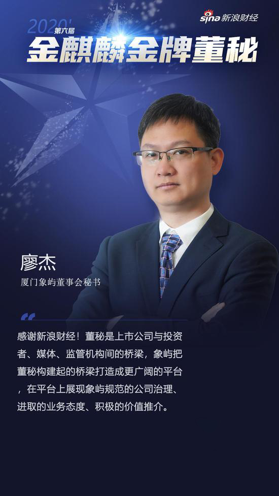廈門象嶼董事會(huì)秘書廖杰獲評新浪財(cái)經(jīng)“2020年度金麒麟·金牌董秘”